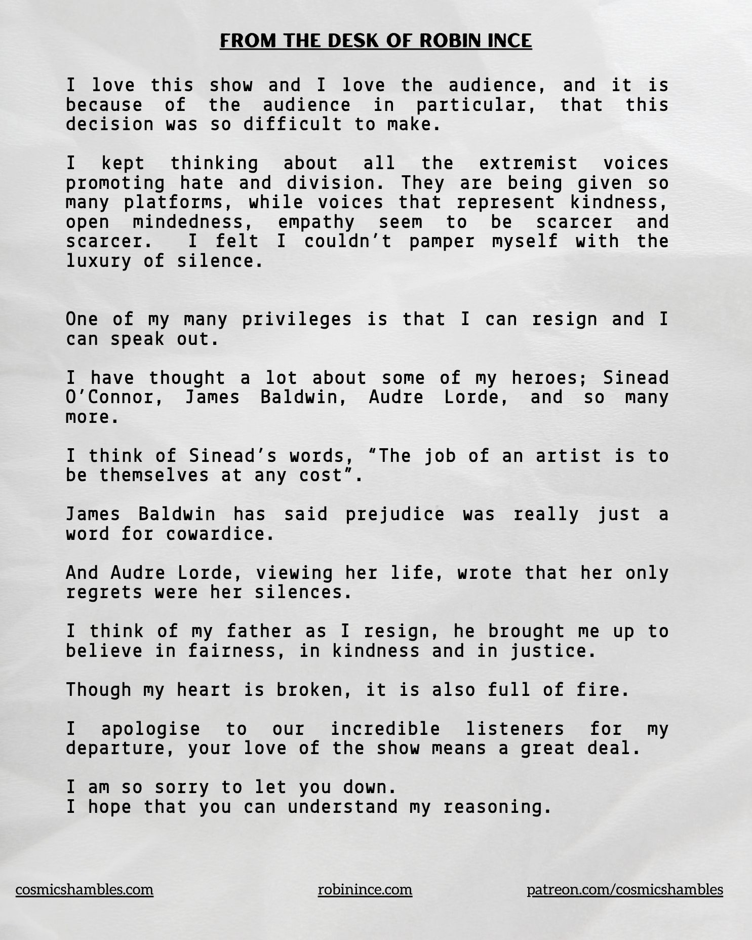 Below is the statement I put out on my socials after the final recording in case you’ve not read it.