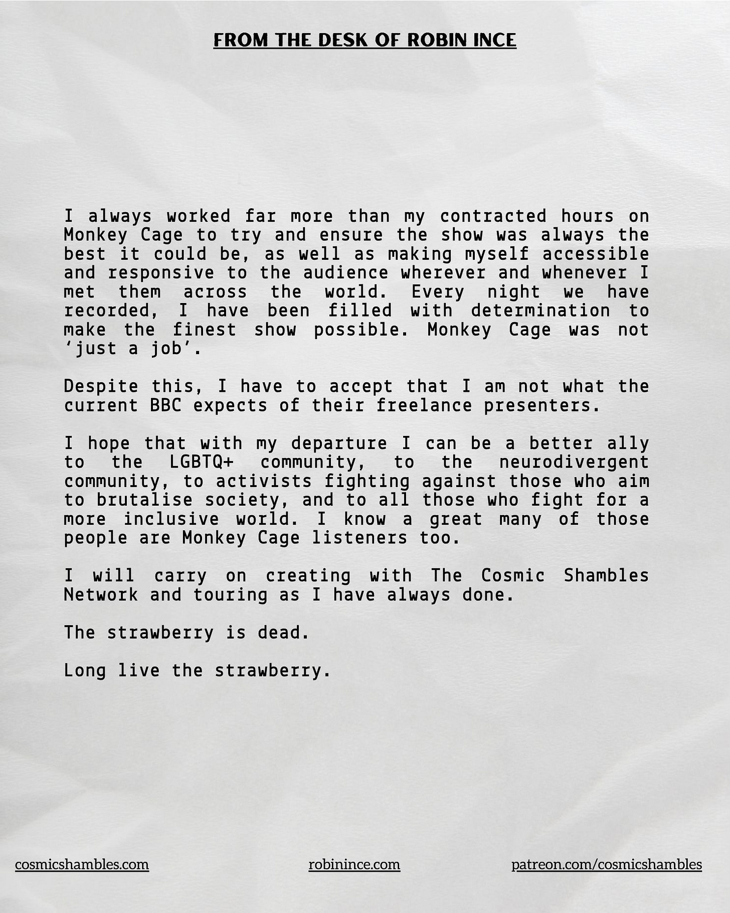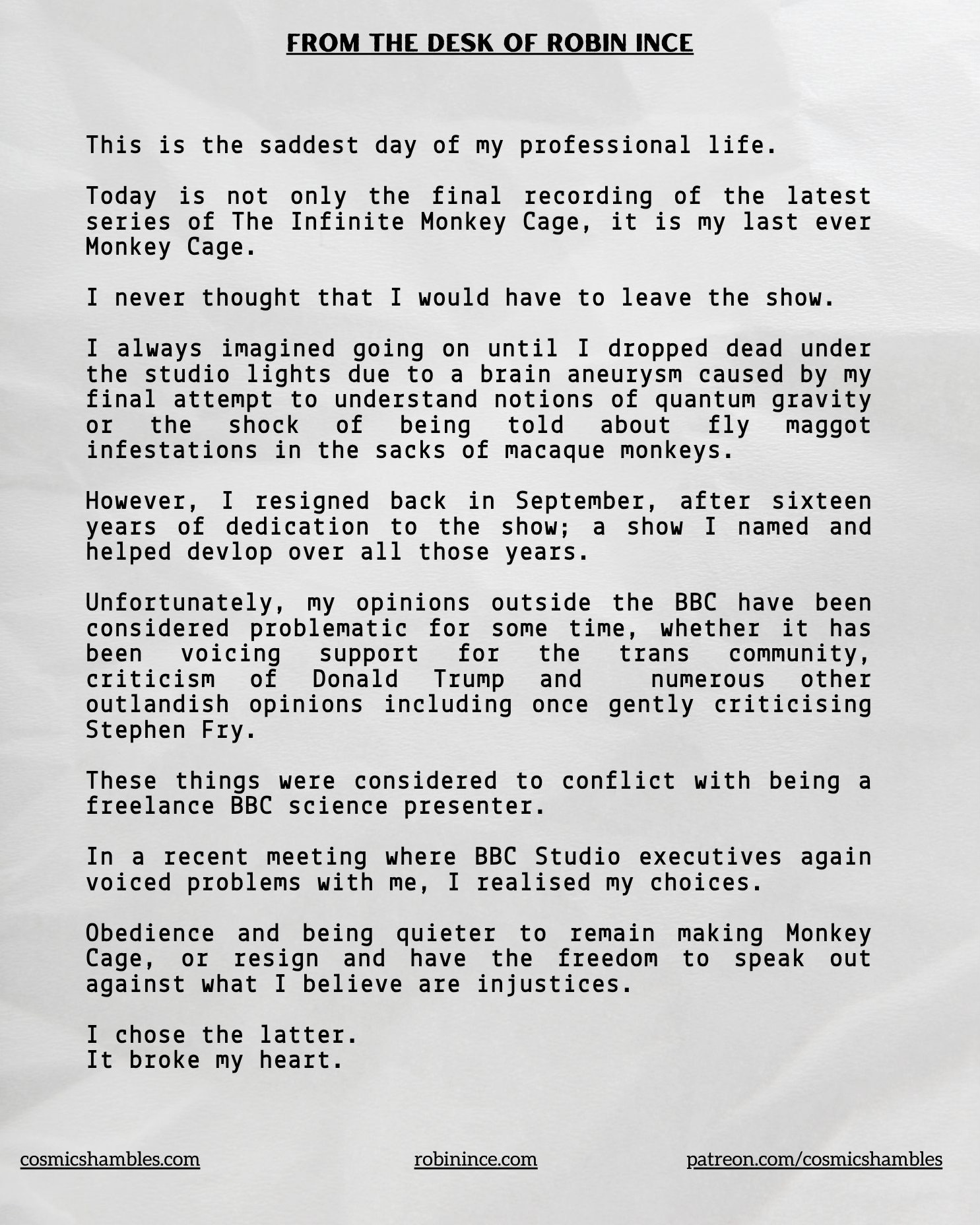 At the end of our recording at the NIA theatre, as the other guests and Brian Cox left the stage, I stood up. Our wonderful producer stood up to thank the audience, but I told her that I needed to say something and it might be best to keep distant as I didn’t want anyone implicated in something I had kept secret from everyone. I can’t remember the last time I shook so much when standing before an audience. I felt intensely emotional. As we finished the recording, my mind was still questioning whether I could do this, or just make it all easy and leave the stage for the final time with no one knowing they would never see me at a Monkey Cage again.
